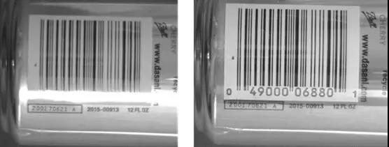 图3:圆罐子上的条码图像。左侧图像中,条码下的打印号码不可读;右侧图像中,使用正交偏振镜后,打印号码清晰可见