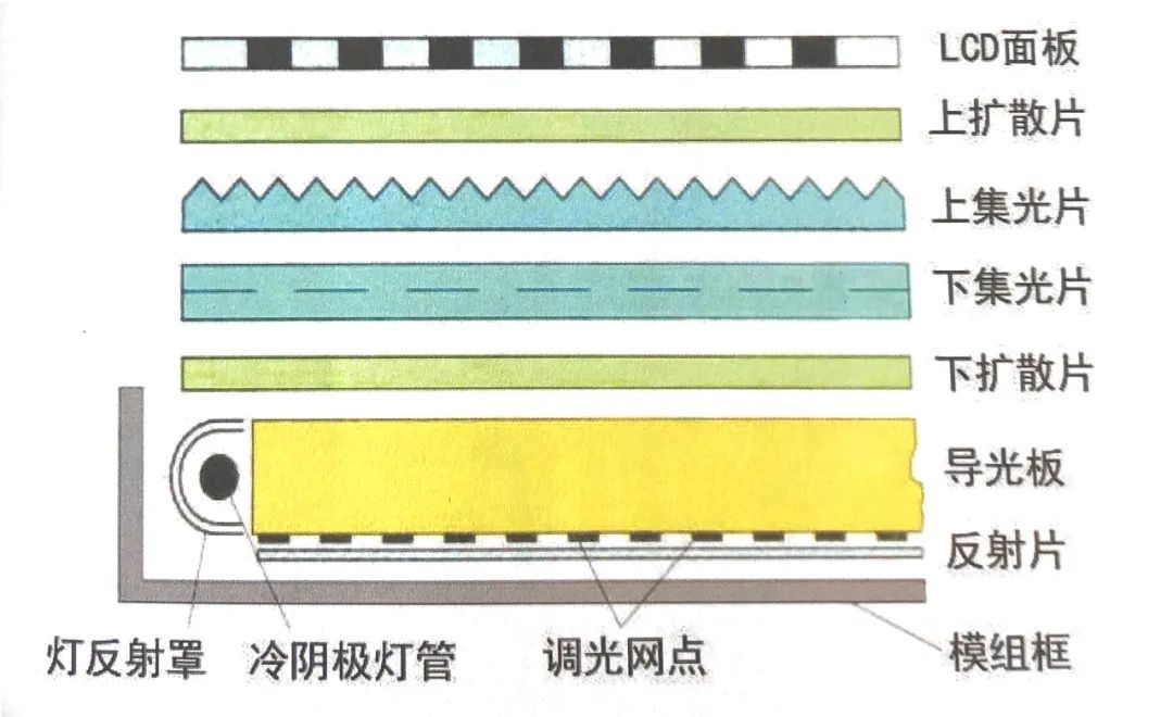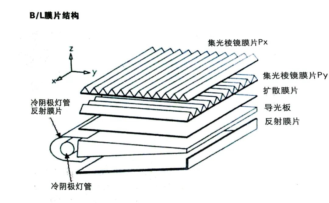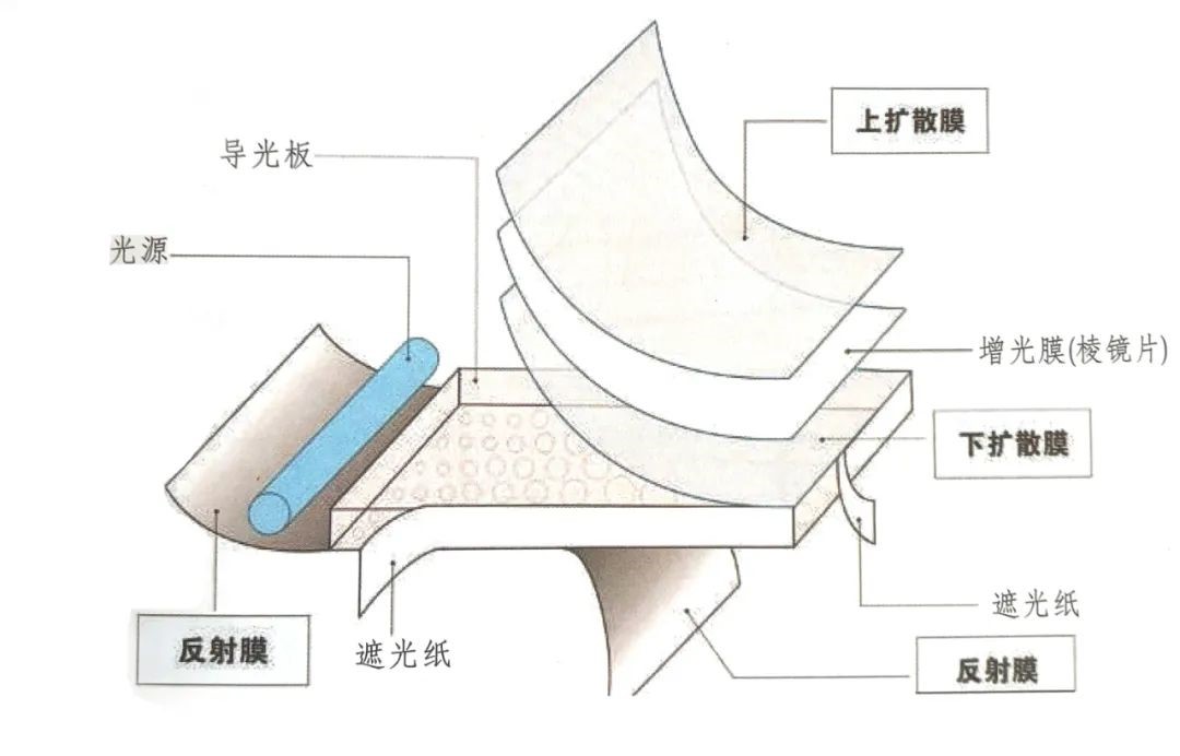 主要组成为发光源(Light source) 、导光板(light guide plate) 、胶框(housing) 、反射片(Reflector) 、扩散片(Diffuser) 、增光片(BEF、棱镜片)、黑白胶(Curtain Tape) 等。