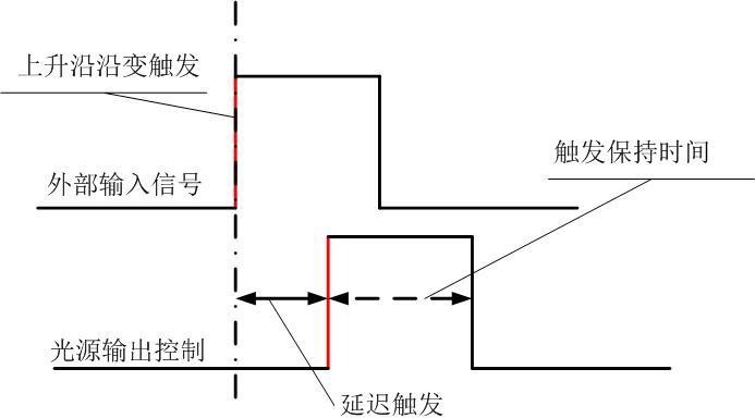 通过此图,我们可以了解到上升沿触发的原理,外部输入信号由低电平----》高电平的沿边过程中,通过硬件输出信号去控制光源,使光源瞬间打开,我们称之为上升沿触发频闪模式。