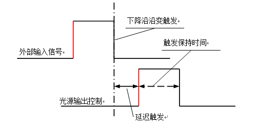 通过此图,我们可以了解到下降沿触发的原理,外部输入信号由高电平----》低电平的沿边过程中,通过硬件输出信号去控制光源,使光源瞬间打开,我们称之为下降沿触发频闪模式。