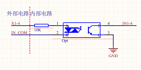 图 4 触发输入信号电路原理图,双向光耦隔离输入:INCOM 为公共端,可接电源正或者负端,和 X1~X4 形成回路 ; 输入电压范围+12V→+24V; 光耦导通(即