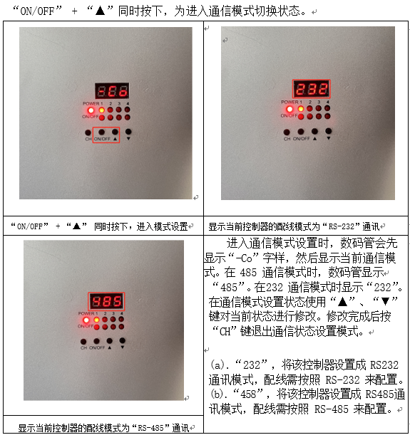 F. “ON/OFF” + “▲”同时按下,为进入通信模式切换状态。G.“CH”+“▲” 同时按下,进入 ID 设置模式。