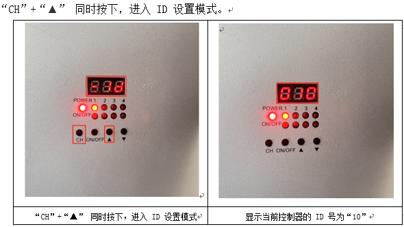 进入 ID 设置模式,数码管会先显示“-ID”字样,然后显示当前 ID 号。使用“▲”和 “▼”键对 ID 号进行修改。系统会自动对 ID 号进行保存。修改完成后按“CH”键退出 ID 设置模式。
