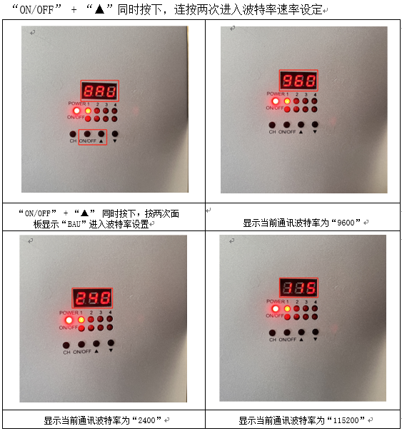 I. “ON/OFF” + “▲”同时按下,按两次;进入波特率设定模式