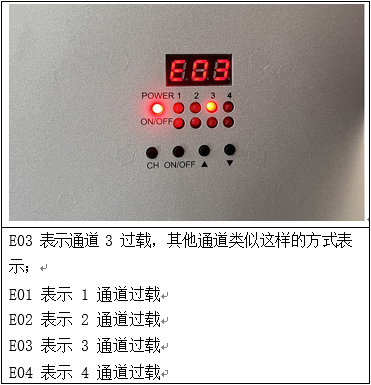 当我们所连接的光源负载超出光源控制器本身驱动能力的时候,我们会对控制器进行保护,从以下方式可知道过流的情况,如状态指示灯闪烁后立即停止输出,光源灭掉,显示面板显示如下图所示现象。
