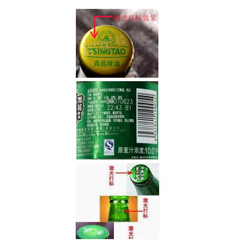 激光打标啤酒瓶主要是通过极高能量的激光束聚焦在啤酒玻璃瓶的表面,在激光高能量的作用下表面层在极短的时间内被物理汽化,从而在表面留下光滑有质感的标记图案,同时,还可控制激光束的有效位移,精确的在啤酒瓶表面标记出精美的图案文字。