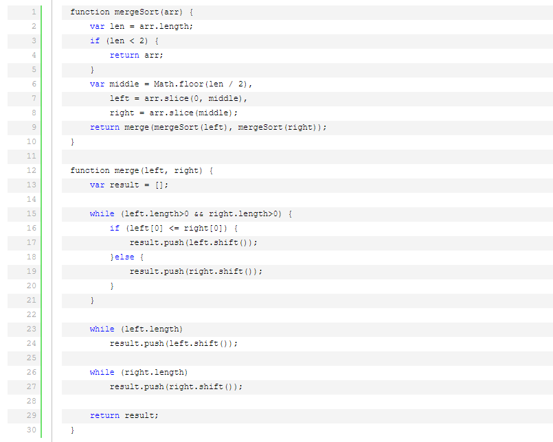 归并排序是一种稳定的排序方法。和选择排序一样,归并排序的性能不受输入数据的影响,但表现比选择排序好的多,因为始终都是O(nlogn)的时间复杂度。代价是需要额外的内存空间。