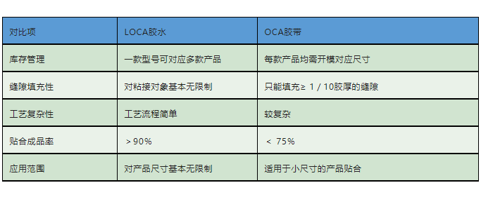 优点:可以粘接曲面或者不平整表面材料,对油墨厚度不敏感,易返工,成本较OCA低。