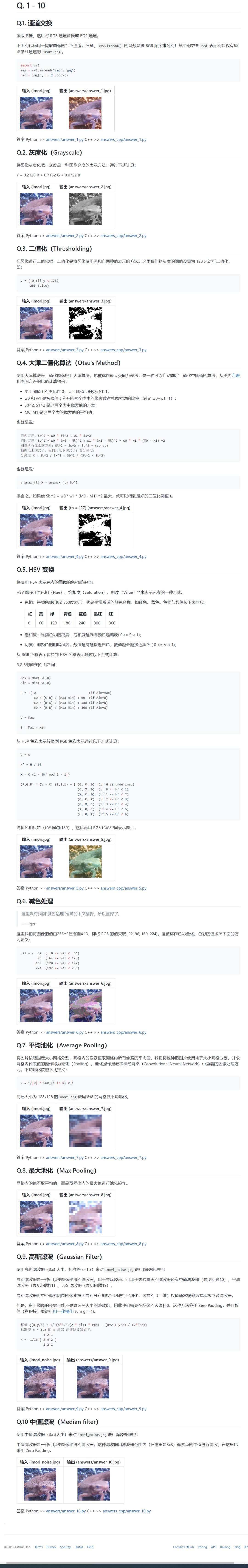 本文整理了图像处理初学者应该需要了解的100个基础问题,涉及读取、显示图像、操作像素、拷贝图像、保存图像、灰度化(Grayscale)、二值化(Thresholding)、大津算法、HSV 变换、减色处理、平均池化(Average Pooling)、最大池化(Max Pooling)、高斯滤波(Gaussian Filter)、中值滤波(Median filter)、仿射变换(Afine Transformations)等100多个知识点。