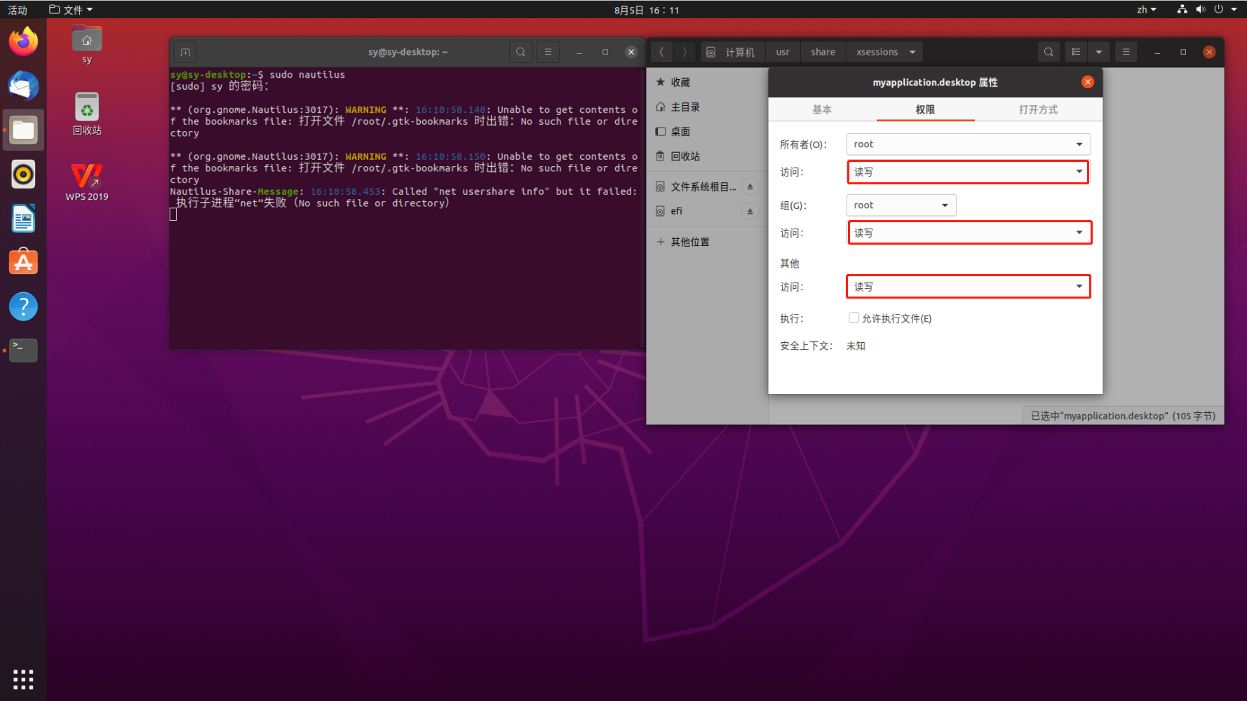 14. 进入“myapplication.desktop”文件权限设置,将访问全设置为读写
