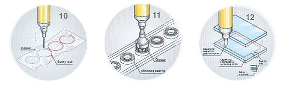 所有液态物可经由气压机械动力做精准的涂布,我们提供从单液简易手持款或桌上型点胶机到具备视觉侦错系统的自动点胶机械,此外也有如AB胶双液混合的点胶设备,一系统完整的零件备品:注射针筒,针筒,针以及针头都充分供应。