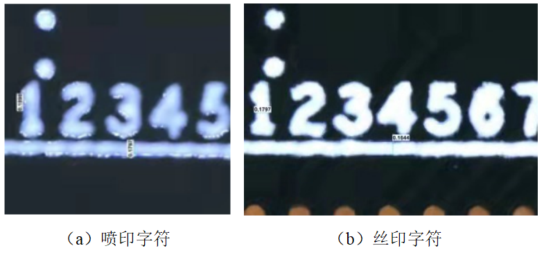 另外,由于喷印油墨极低粘度的特点,在油墨组分上同丝印油墨差异很大,表现在PCB基材上的白度和立体感往往会比现有丝印油墨要显得弱一些,有时就会觉得相同厚度和大小字符下丝印字符可能会更清楚,但是由于喷印墨水的流平性会好一些,所以喷印字符会觉得更光滑点。这里应该坚持以IPC字符标准——目视清晰可辨——为依据来判断字符质量是否符合要求,不能强求喷印和丝印完全一致。