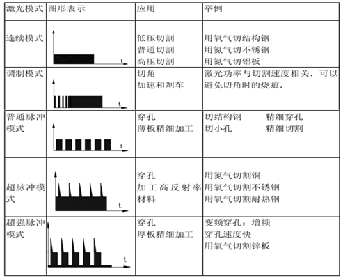 在连续模式下,激光输出的功率是恒定的,这使得进入板料的热量比较均匀,它适合于一般情况下较快速的切割,一方面可以提高工作效率,另一方面也是避免热量集中导致热影响区组织恶变的需要。调制模式的激光功率是切割速度的函数,它可以通过限制在各点处的功率使进入板料的热量保持在相当的低水平,从而防止切缝边缘的烧伤。由于它的控制比较复杂,因此效率不是很高,只在短时段内使用。脉冲模式虽可细分为三种情况,实质上只是强度的差别,往往根据材料的特性和结构的精度来选择。