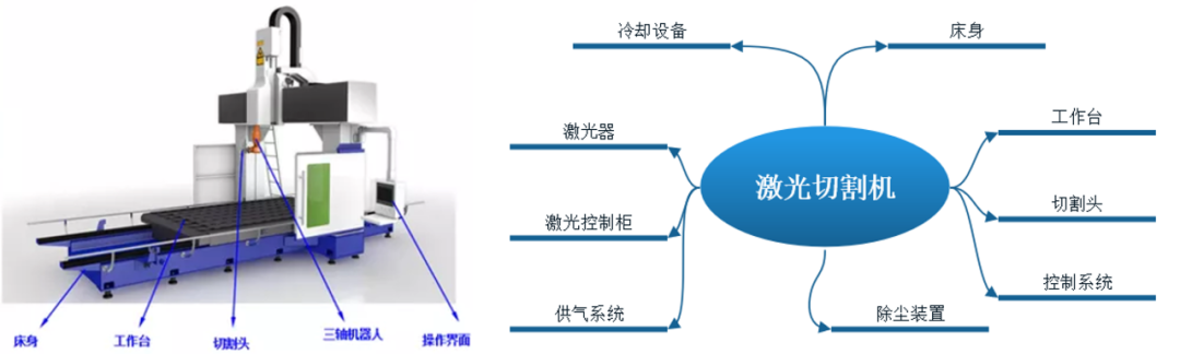 激光切割设备激光切割的设备大体主要由以下几个部分组成:床身、工作台、切割头、控制系统、激光控制柜、激光器、冷却设备、除尘装置、供气系统等。