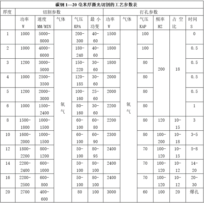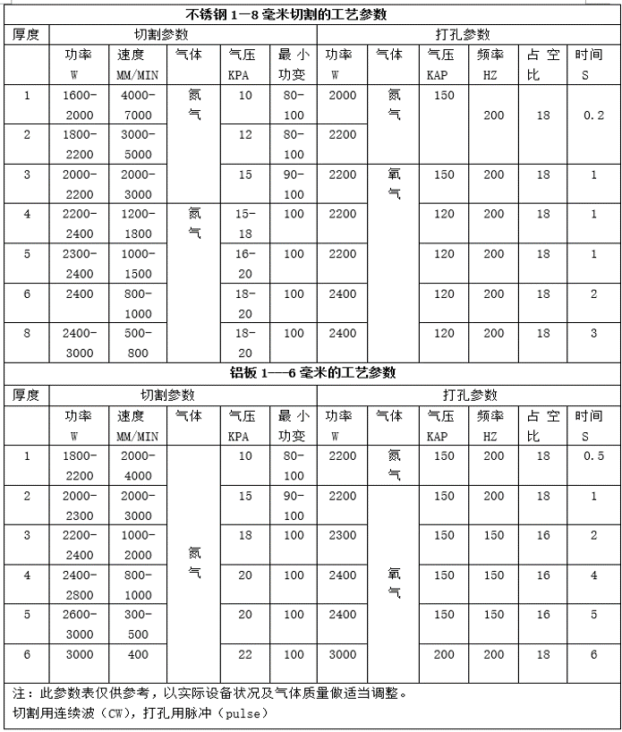 下图是是Rofin DC030激光器针对碳钢和不锈钢的参考参数: