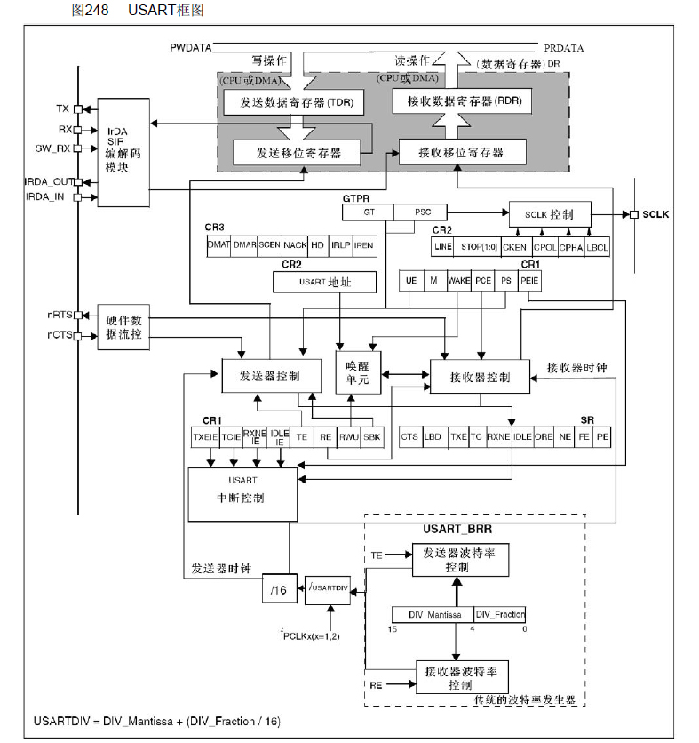 UART(USART)框图这个框图分成上、中、下三个部分。本文大概地讲述一下各个部分的内容,具体的可以看《STM32中文参考手册》中的描述。