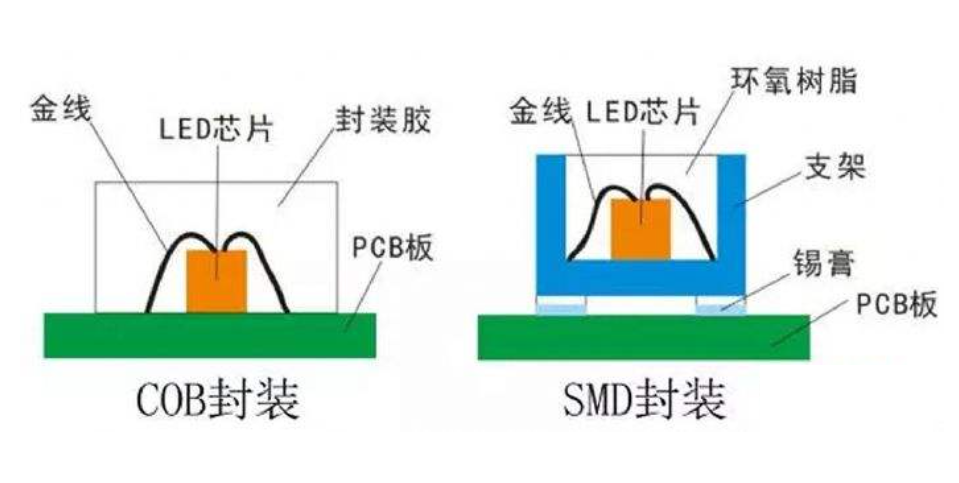 COB封装全称板上芯片封装(ChipsonBoard,COB),是为了解决LED散热问题的一种技术。相比直插式和SMD其特点是节约空间、简化封装作业,具有高效的热管理方式。