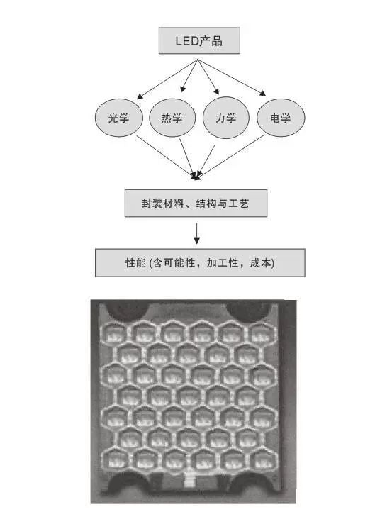 大功率LED封装主要涉及光、热、电、结构与工艺等方面。这些因素彼此既相互独立,又相互影响。其中,光是LED封装的目的,热是关键,电、结构与工艺是手段,而性能是封装水平的具体体现。从工艺相容性及降低生产成本而言,LED封装设计应与晶片设计同时进行,即晶片设计时就应该考虑到封装结构和工艺。否则,等晶片制造完成后,可能由于封装的需要对晶片结构进行调整,从而延长了产品研发周期和工艺成本,有时甚至不可能。