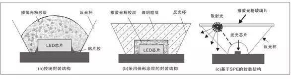 传统的萤光粉涂敷方式是将萤光粉与灌封胶混合,然后点涂在晶片上。由于无法对萤光粉的涂敷厚度和形状进行精确控制,导致出射光色彩不一致,出现偏蓝光或者偏黄光。而Lumileds公司开发的保形涂层(Conformal coating)技术可实现萤光粉的均匀涂覆,保障了光色的均匀性,如图4b。但研究表明,当萤光粉直接涂覆在晶片表面时,由于光散射的存在,出光效率较低。有鉴于此,美国Rensselaer研究所提出了一种光子散射萃取工艺(Scattered Photon Extraction method, SPE),通过在晶片表面布置一个聚焦透镜,并将含萤光粉的玻璃片置于距晶片一定位置,不仅提高了器件可靠性,而且大大提高了光效(60%)。