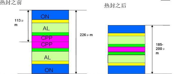 CPP层材料与金属Ni、Al及极耳胶具有良好的热封粘结性,本身具有良好的耐电解液和抗HF性能,同时CPP层也有较好的绝缘性和物理防护性能,可以有效防止电极与锂离子电池软包材料之间的短路从而引起的铝塑膜腐蚀。