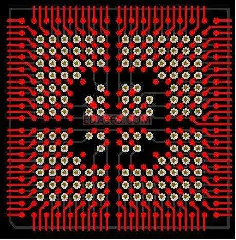 在BT树脂/玻璃芯板的两面层压极薄(12~18μm厚)的铜箔,然后进行钻孔和通孔金属化。用常规的PCB加3232艺在基板的两面制作出图形,如导带、电极、及安装焊料球的焊区阵列。然后加上焊料掩膜并制作出图形,露出电极和焊区。为提高生产效率,一条基片上通常含有多个PBG基板。
