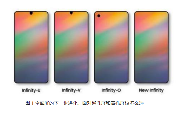 随着智能显示的飞速发展,消费者对显示设备颜值的追求越来越高。试想我们的手机屏幕点亮时是一块显示无死角的显示屏那自然是极好的,所以偏执的消费者追求极致的的屏占比;屏下指纹技术及听筒隐藏设计的出现,让全面屏技术日趋成熟,所以隐藏摄像头成为我们追求完美显示的最后拼图。从iphone X最早的刘海屏到夏普的美人尖,到OPPO水滴屏,再到三星和华为的打孔屏(通孔和盲孔),可谓百花齐放,百家争鸣的全面屏时代。如下图1所示:人们对于手机显示的探索脚步从未停止过。截止目前来看,打孔实现对前置摄像头的安放,可以进一步提升手机正面显示区域的利用面积,可能是目前为止来说较为合理的方案。