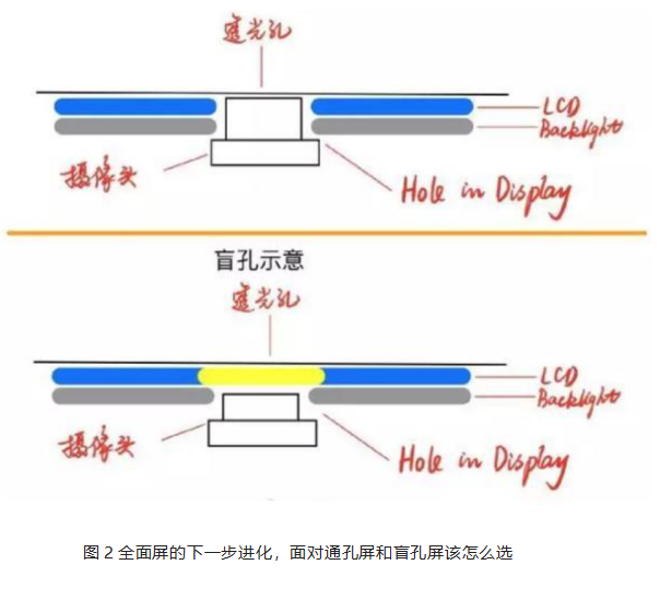打孔方案通俗来说就是在屏幕上开了孔,分为通孔和盲孔两种打孔方式;众所周知,手机的一块屏幕有多层结构。通孔的解决方案是在屏幕的保护玻璃下,所有的层都穿孔(除了最外面的盖板玻璃),让前置摄像头穿过液晶层以及背光模组嵌入孔洞中,而盲孔则是保留了液晶和盖板不打孔。(如下图2示意图);