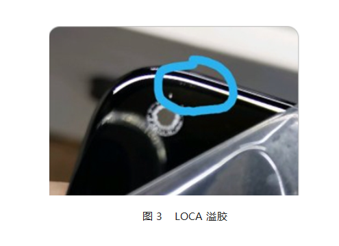 1、选用LOCA即采用水胶的方式,由于LOCA的流动性使其具备很高的填充性能,能够很好的填充偏光片的圆孔。但同时也存在溢胶问题,如果溢胶到偏光片边缘会造成折射率存在偏差,会引起较为明显的显示缺陷,如图3,因此LOCA方案不可行。