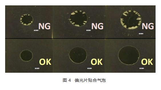 2、所以各大屏厂工程师转换方向依靠全贴合OCA解决。起初的全贴合OCA由于填充性能不足(填充段差30%),导致偏光片边缘出现图4的边缘气泡,一直无法解决。