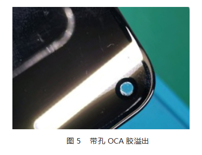 4、在普通全贴合OCA上先模切成带孔OCA,然后和打孔的偏光片精准对位完成全贴合,这个很考验贴合精度,对贴合工艺要求很高,而且脱泡后OCA胶很容易从边缘溢出来。如图5所示:
