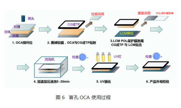 这种树脂具备常温下普通全贴合OCA的性能,能很好的完成分切,模切等加工,不会影响尺寸稳定性,一旦完成贴合后在加热加压的条件下具备很好的流动性,可以很好的填充偏光片的圆孔,照射UV后具备很好的信赖性,盲孔OCA使用过程如下图6所示: