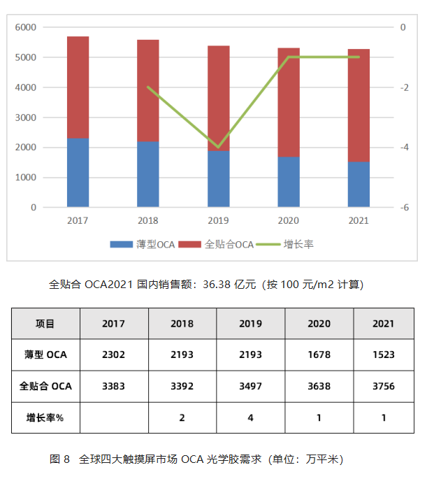 根据研究机构于2019年的调研数据,2018年全球四大触摸屏市场(智能手机、平板电脑、笔记本电脑及车载显示市场,不包括返修市场,下同)OCA光学胶需求量为5586万平米,预计到2021年,全球四大触摸屏市场OCA光学胶需求量为5279万平米,复合增长率为-1.8%,整体市场呈下滑趋势,但市场用量仍然巨大。