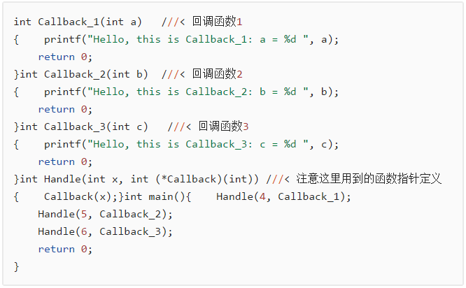 如上述代码:可以看到,Handle()函数里面的参数是一个指针,在main()函数里调用Handle()函数的时候,给它传入了函数Callback_1()/Callback_2()/Callback_3()的函数名,这时候的函数名就是对应函数的指针,也就是说,回调函数其实就是函数指针的一种用法。