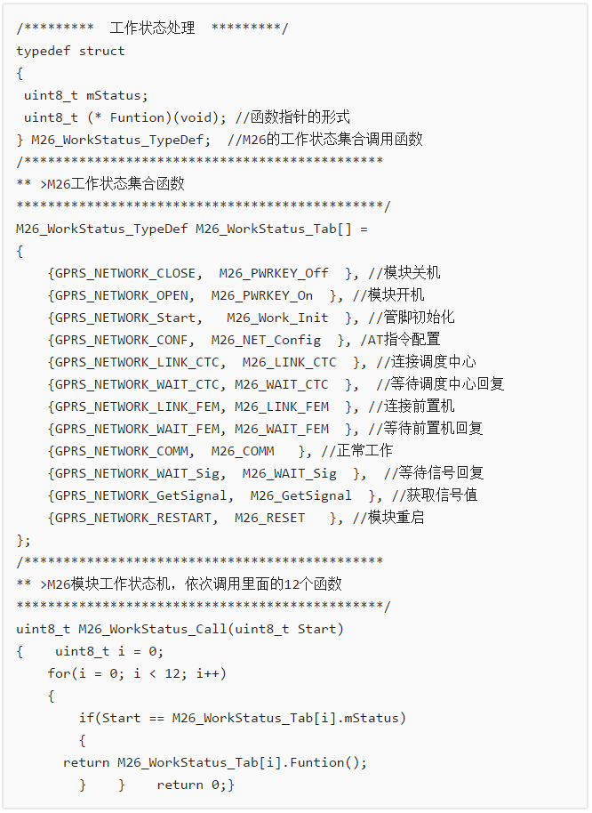 一个GPRS模块联网的小项目,使用过的同学大概知道2G、4G、NB等模块要想实现无线联网功能都需要经历模块上电初始化、注册网络、查询网络信息质量、连接服务器等步骤,这里的的例子就是,利用一个状态机函数(根据不同状态依次调用不同实现方法的函数),通过回调函数的方式依次调用不同的函数,实现模块联网功能,如下:
