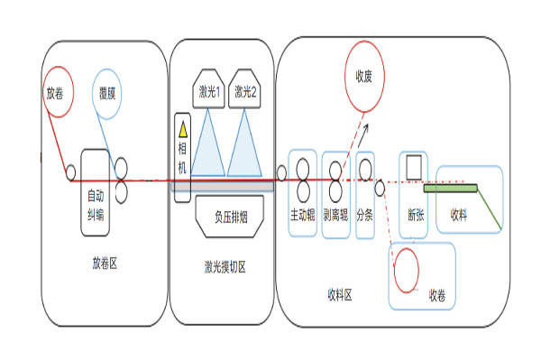 如图1所示,数字激光模切机由收放料机构和激光模切系统两部分组成。其中,收放料机构和传统的模切机一样,只要调节好收放料的张力即可,而激光模切系统在模切时需要注意调节其激光器的功率大小,这点尤为重要。因为模切不同的材料,所需调节的功率不相同;材料切全穿和切半穿,所需调节的功率不相同;同一种材料,不同的模切速度,所需调节的功率也不相同。一般情况下,模切速度越快,调节的功率越大;模切速度越慢,调节的功率越小。