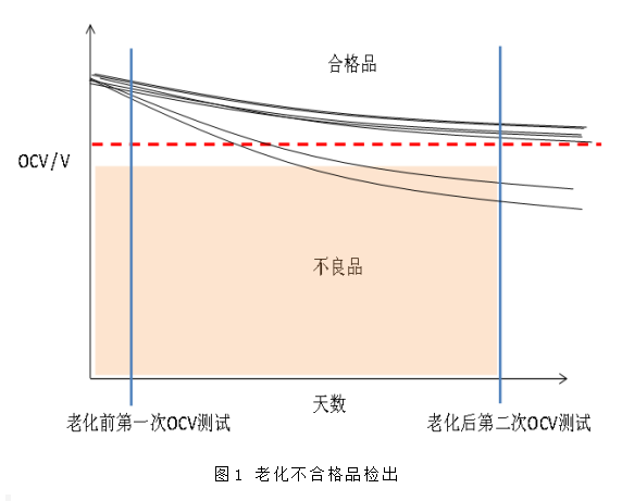 一般老化程序为:充电到4.0-4.2V,常温存储 7d,高温45℃存储7d,检测电池老化前后的电压差剔除不合格品。将电池在高温或常温状态下开路搁置 7 天或 28 天,通过对电池放电至截止电压测量其放电电量来判断其自放电性能。该方法需要对电池进行长达一个月的搁置检测,时间周期长,影响因素大,准确度也不高,并且长时间占用了较多的设备和场地,测试安全性差,是对人力和财力的大量浪费。英国纽卡斯尔大学的Pierrot S. Attidekou通过交流阻抗手段的应用,将锂离子电池自放电筛选时间从数周缩短到了10min之内,通过继续优化,有望将筛选时间继续缩短到1min。