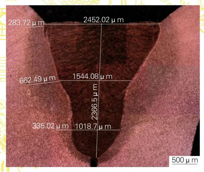 熔池宽深比,是指焊缝熔池深度与宽度的比值。若客户对于焊接产品有强度要求,需要将焊接产品通过线切割→镶嵌→磨抛→腐蚀→显微镜金相分析这一系列步骤,根据焊缝的深宽比值反映焊接强度,更多的是硬度方面的体现,也可通过拉伸强度测试反馈焊接的拉伸强度指标。熔深比金相分析如图2所示。