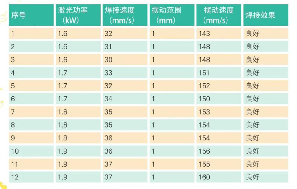 从上述试验数据可以看出,在摆动焊接碳钢板的过程中,随着焊接速度的增加、激光功率也要适当增加,在保证摆动范围不变的情况下,需要增加摆动速度,来保证焊接效果。若是摆动速度过小会出现焊缝不均匀的情况。