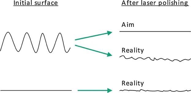 激光抛光的目的是尽可能降低表面粗糙度。理想的激光抛光工艺将使表面完全光滑,没有任何粗糙度(图1,顶部)。然而,在现实中,激光抛光后总是存在粗糙度(图1,中间)。