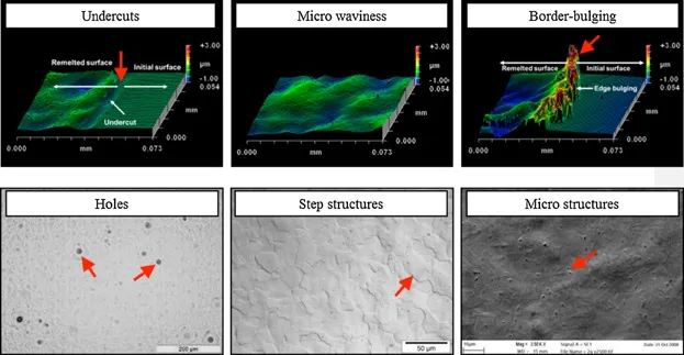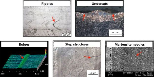 由熔体和凝固前沿动力学产生的表面结构(波纹、咬边)以及由塑性变形和微观结构变化产生的表面结构(凸起、台阶结构和马氏体针状物)。