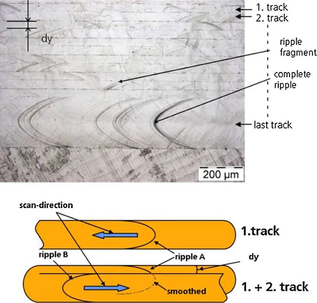 图3 带重叠的激光抛光轨道(顶部:光显微照片,底部:示意图),材料:1.2343,dL?=?250?μm,dy?=?40?μm。