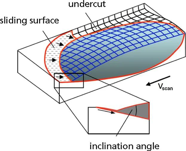 如果熔池的倾角小于临界角(取决于材料和表面张力),则熔融和凝固前沿之间过渡区域的熔体由于毛细管力开始滑动(图4)。熔体的滑动导致咬边的形成。