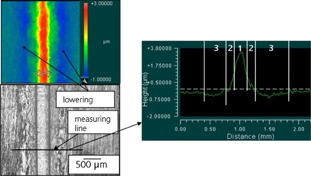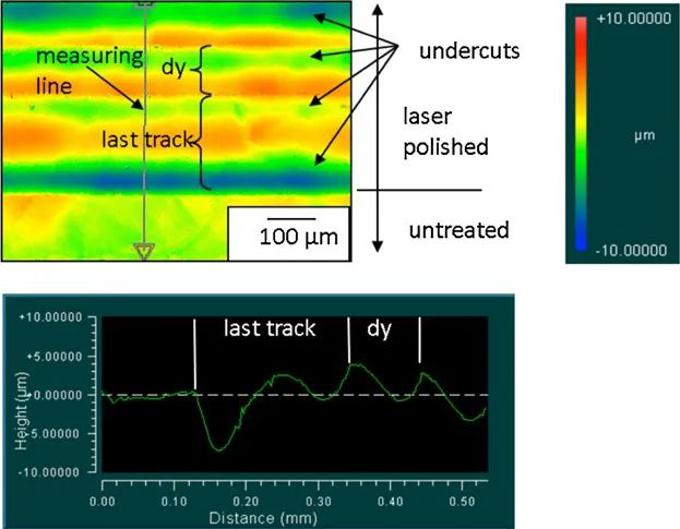 图5 顶部:带有明显咬边的激光抛光场最后轨迹的白光干涉显微照片(材料:1.2782);底部:最后轨迹的轮廓。