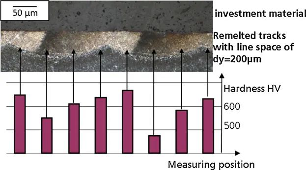 图7 顶部:重熔激光轨迹的横截面;低底:硬度剖面。