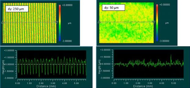 图8 顶部:具有不同轨迹偏移的两个激光抛光表面的三维轮廓;底部:沿标记线的字段轮廓。
