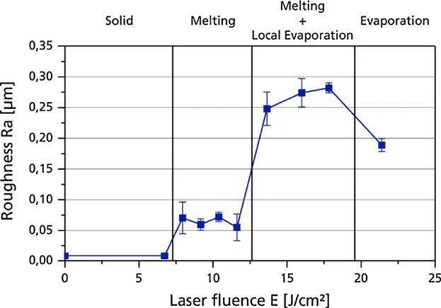 固体状态:对于低激光注量,注量太低,无法熔化表面。在这种情况下,与初始粗糙度相比,粗糙度不会改变。
