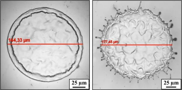 只有在使用高通量时,才会出现边界膨胀。在这种情况下,在抛光过程中可以看到强烈的等离子体形成,这表明材料正在蒸发。在表面与一个激光脉冲相互作用后,材料重新分布在重熔区域:部分材料从熔池中心推到边缘。凸起的高度可以是几微米。在某些通量非常高的情况下,甚至可以看到材料飞溅出激光/材料相互作用区(图12)。由于材料的径向移动,在这种情况下,有效激光束直径增加。