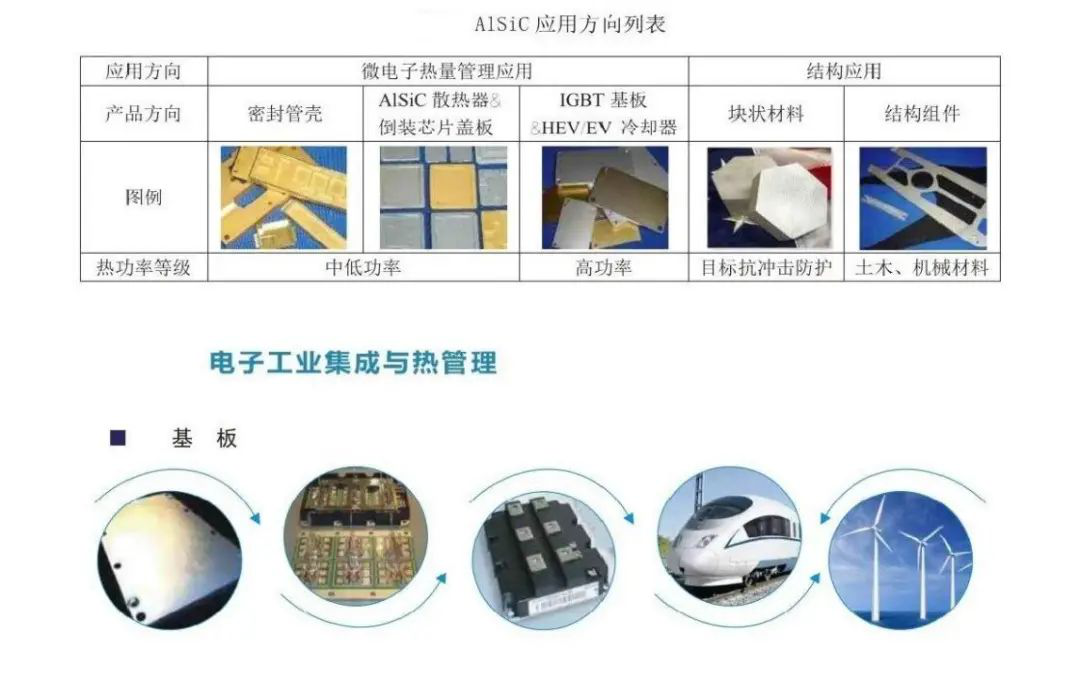 由于AlSiC电子封装材料及构件具有高弹性模量、高热导率、低密度的优点,而且可通过SiC体积分数和粘接剂添加量等来调整膨胀系数,实现与GaAs芯片和氧化铝、氮化铝等基板的热匹配;同时可近净成形形状复杂的构件,因此生产成本也较低,使其在微波集成电路、功率模块和微处器盖板及散热板等领域得到广泛应用。