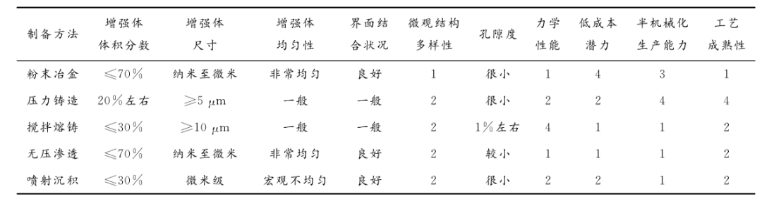 与其他制备方法相比,搅拌熔铸法优势为SiCp/Al材料力学性能较好,制备成本最低,缺点在于难以完成大体积分数SiC的SiCp/Al复合材料的制备。