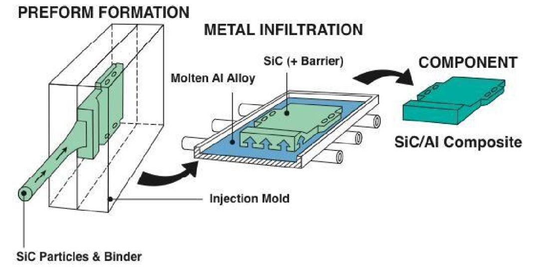 AlSiC(SiCp/Al)材料虽然具有优异的力学与物理特性,但是实现高体积分数SiC的SiCp/Al材料的制备一直是制约该行业发展的难题。如何实现经济、快速、高品质、低次品率的工业化生产,是SiCp/Al材料行业发展的机遇与挑战。目前,SiCp/Al材料制备方法与工艺的研究,主要分为粉末冶金、搅拌熔铸、共喷沉积、无压渗透与压力渗透五种。